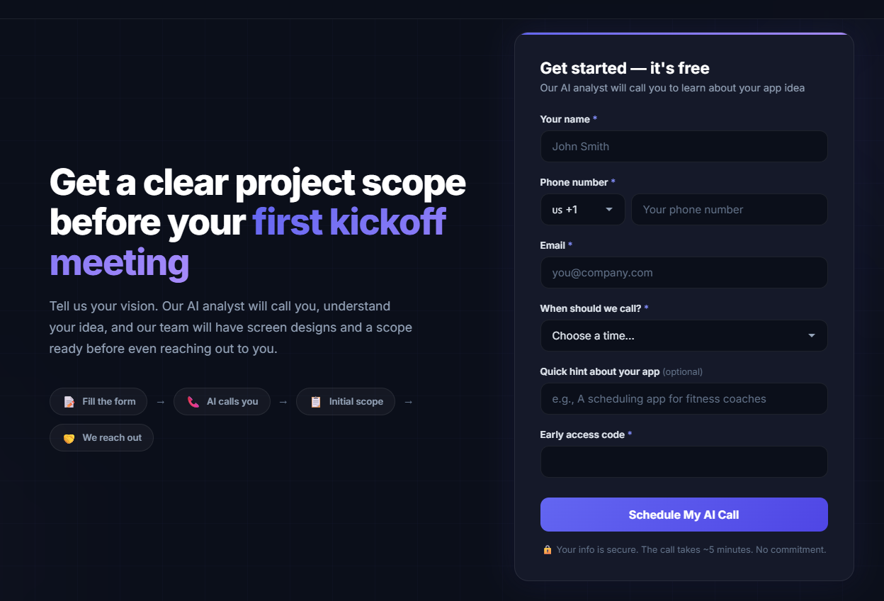 📝 Cocriação de escopo: Startups colaboram com o AI para definir requisitos detalhados durante uma ligação rápida.