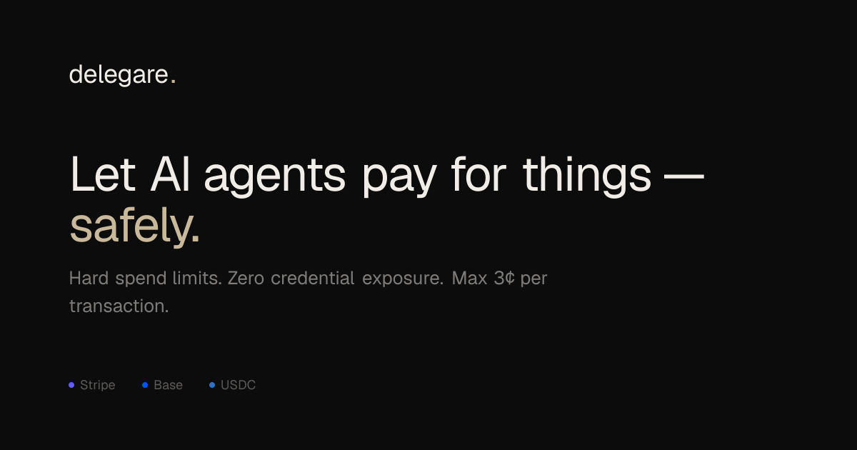 Descrição da ferramenta: Delegare permite que agentes de IA realizem pagamentos com limites e regras específicas, garantindo controle total sem compartilhar informações sensíveis, ideal para integrações via API, SaaS e fluxos de trabalho automatizados.