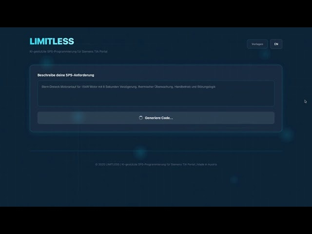 Descrição da ferramenta: LIMITLESS Automation converte comandos em linguagem natural em código PLC compatível com Siemens TIA Portal, facilitando a automação de bombas, motores, filtros e lógica de segurança. Permite gerar códigos rapidamente e oferece duas execuções gratuitas para testes.