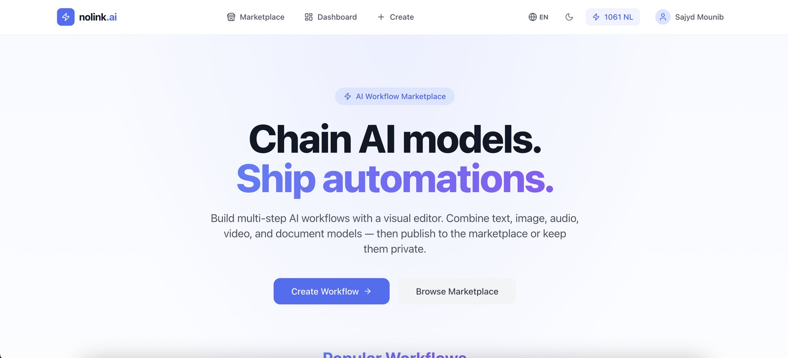 Descrição da ferramenta: nolink.ai permite criar e automatizar fluxos de trabalho de inteligência artificial combinando modelos de texto, imagem, áudio, vídeo e documentos. Facilita automações complexas com um clique e possibilita monetização ao compartilhar os workflows na plataforma.
