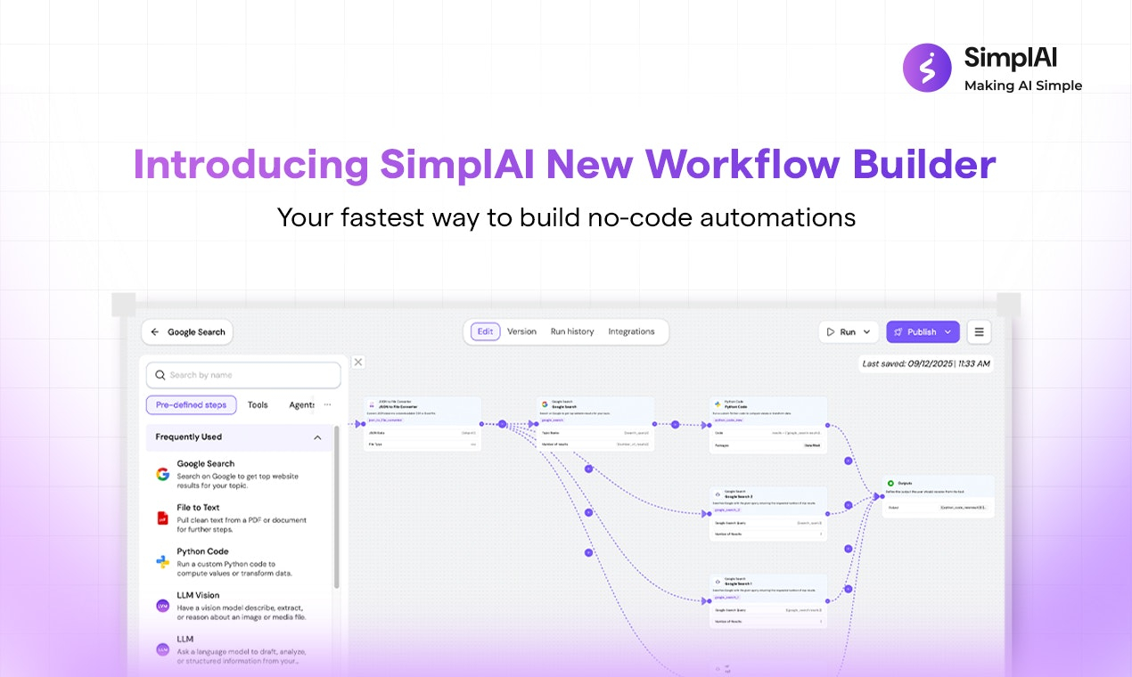 Descrição da ferramenta: O SimplAI New Workflow Builder permite criar fluxos de trabalho complexos e prontos para produção rapidamente, utilizando uma interface intuitiva que integra mais de 300 serviços, sem necessidade de configuração técnica avançada.