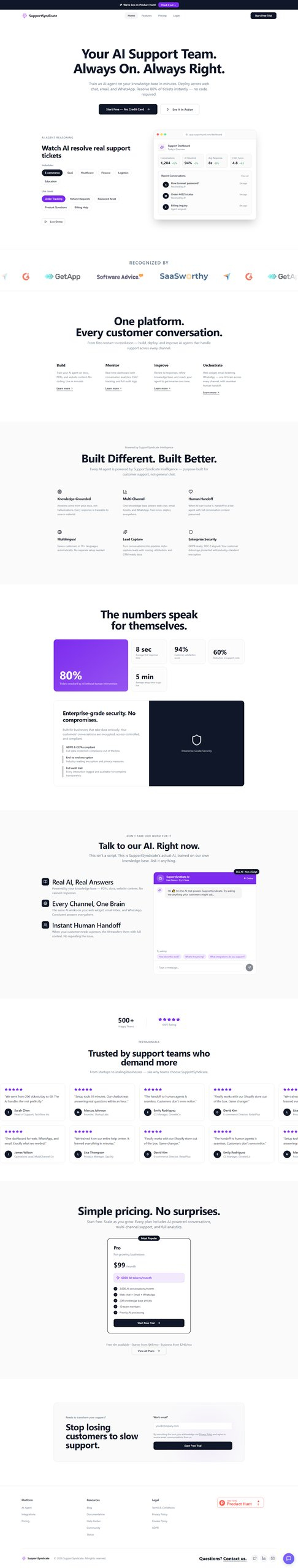 Descrição da ferramenta: SupportSyndicate é uma solução de suporte ao cliente baseada em inteligência artificial, projetada para atender SaaS e comércio eletrônico, automatizando de 60 a 90% dos tickets de suporte via web, email e WhatsApp, garantindo atendimento contínuo 24/7.