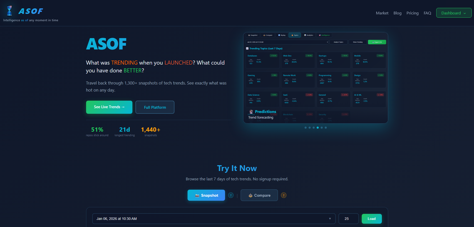 Descrição da ferramenta: ASOF é uma plataforma que captura e analisa tendências tecnológicas ao longo do tempo, coletando dados de sites como Hacker News, GitHub Trending, Reddit e Product Hunt a cada 30 minutos para identificar mudanças e padrões emergentes.