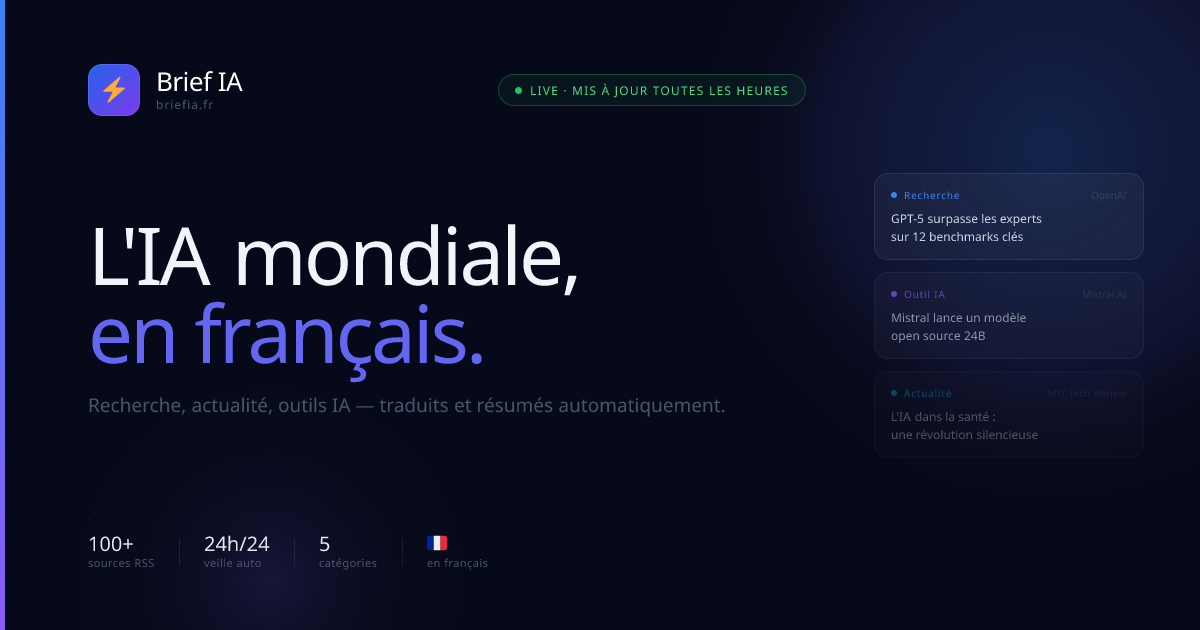 Descrição da ferramenta: Brief IA compila e traduz diariamente mais de 70 fontes globais de inteligência artificial, oferecendo resumos em francês por meio de newsletters gratuitas, feeds em tempo real e briefs matinais para profissionais de IA francófonos.