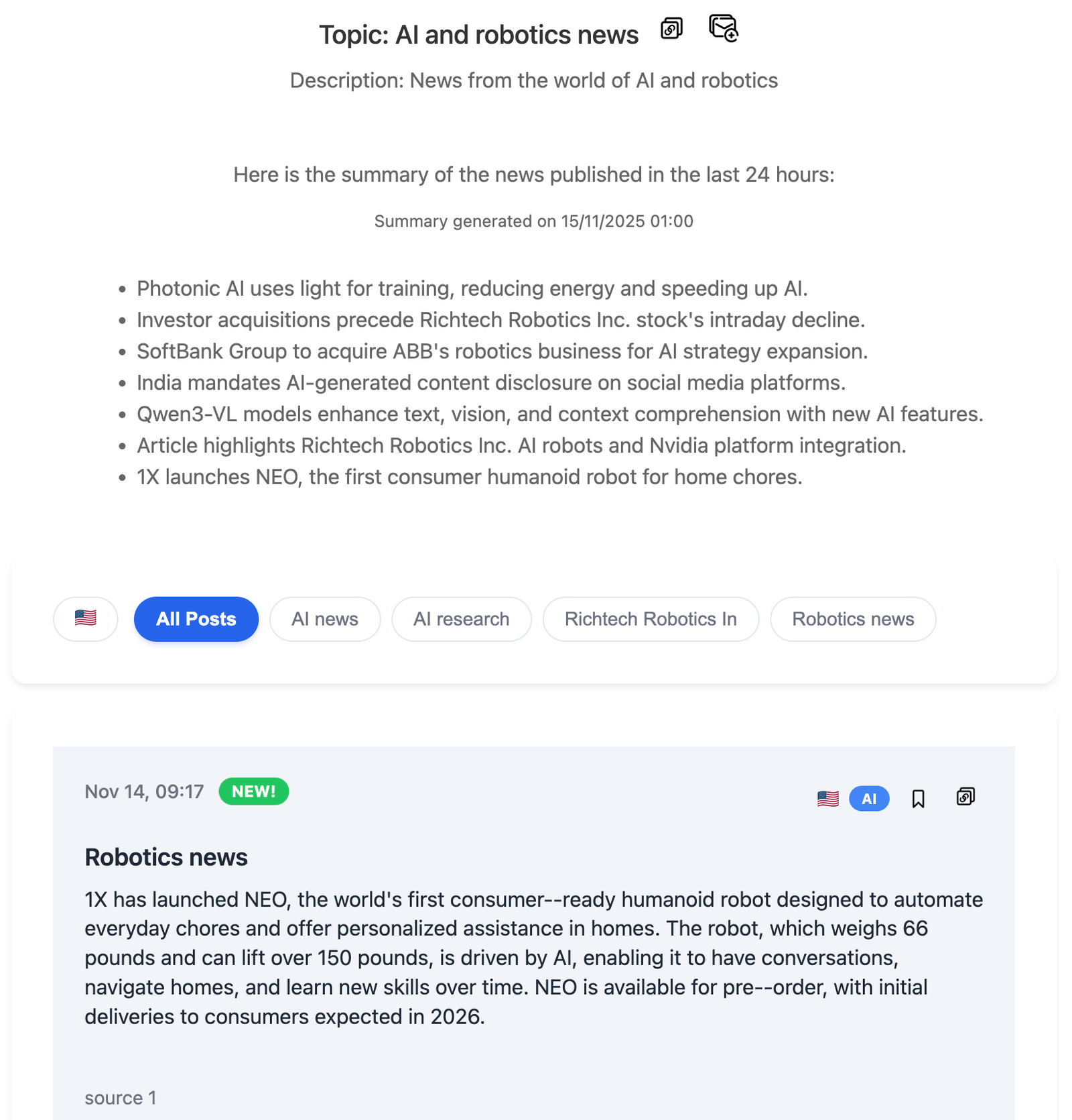 🤖 Automação: Utiliza agentes de IA para monitorar fontes continuamente sem intervenção manual.