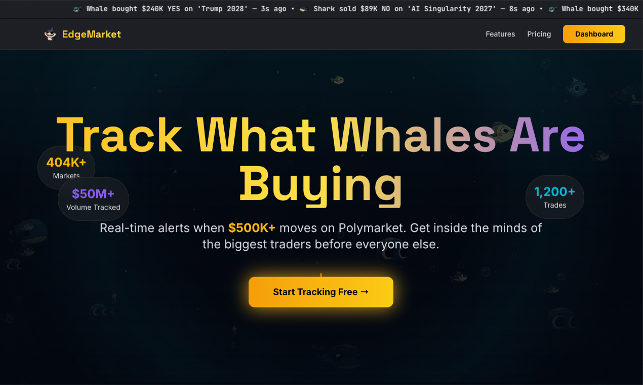 Descrição da ferramenta: O Edge Market fornece alertas em tempo real sobre movimentações superiores a $500 mil no Polymarket, utilizando análises de IA para monitorar grandes investidores e transações na blockchain, com notificações rápidas por diversos canais.