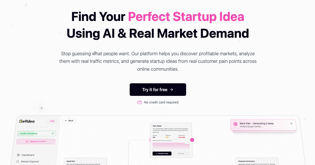 Descrição da ferramenta: GetIdea identifica problemas reais discutidos online, auxiliando na geração de ideias de startups com base em análises de Reddit e fóruns, incluindo dados de tráfego e expansão para submercados relevantes.