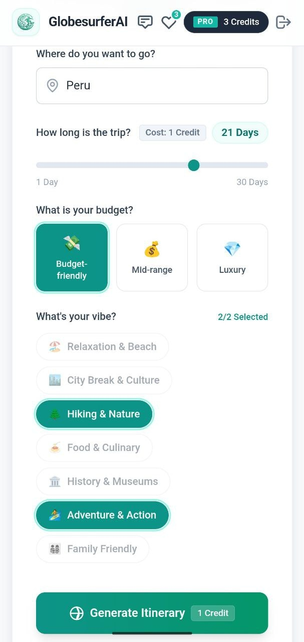 Descrição da ferramenta: GlobesurferAI é uma plataforma de planejamento de viagens que utiliza inteligência artificial para criar roteiros personalizados, considerando diferentes estilos e orçamentos, facilitando a organização de férias ideais com recomendações específicas.