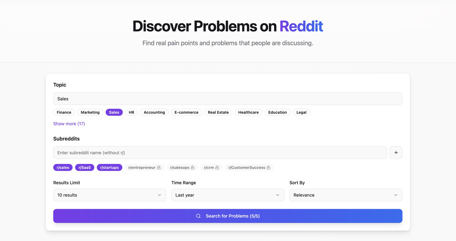 Descrição da ferramenta: Reddit Problem Finder identifica dores reais dos usuários no Reddit, permitindo adicionar subreddits e tópicos, monitorar frustrações recorrentes e transformar esses insights em ideias de produtos testáveis. Ideal para desenvolvedores independentes, gerentes de produto e fundadores.