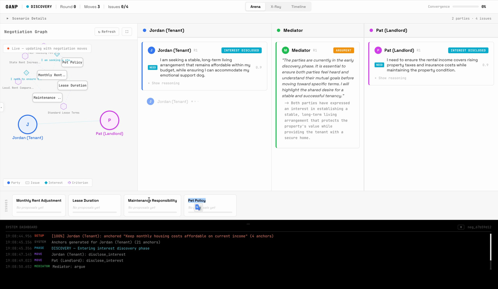 Descrição da ferramenta: OANP é uma plataforma que simula negociações complexas entre agentes de IA, permitindo testar estratégias, identificar interesses ocultos e avaliar resultados em cenários de arbitragem e resolução de conflitos.