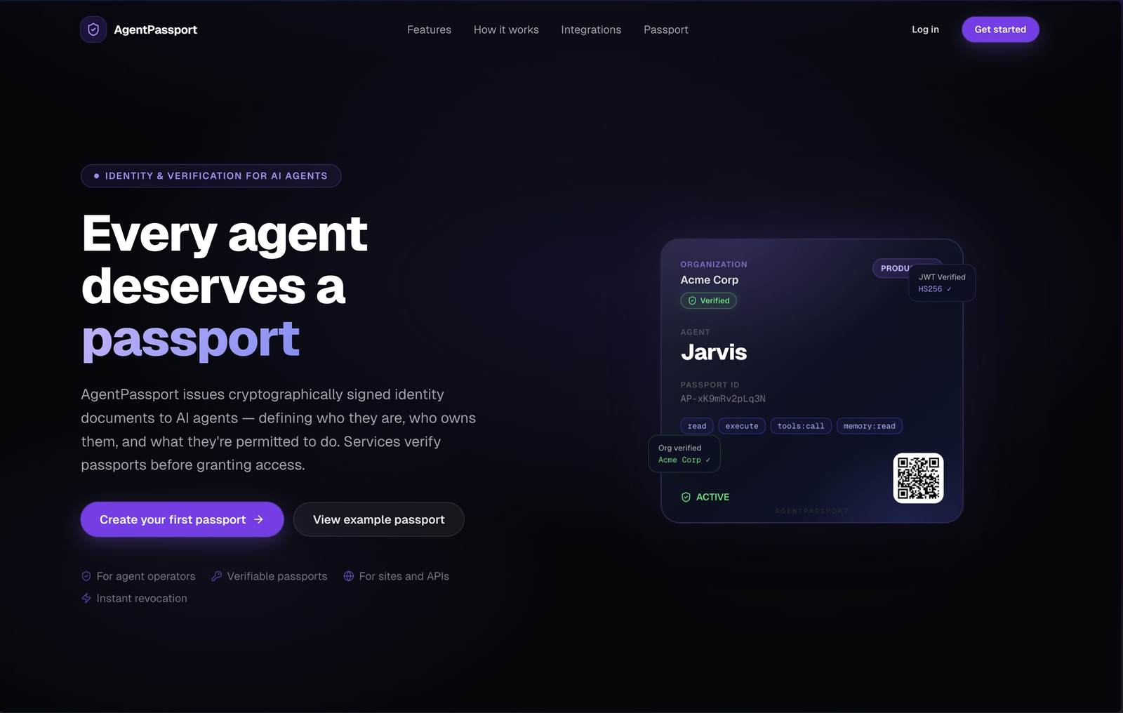 Descrição da ferramenta: AgentPassport é uma camada de identidade e confiança para agentes de IA, que emite passaportes verificáveis, permitindo autenticação, autorização e gerenciamento de confiança em chamadas de API.