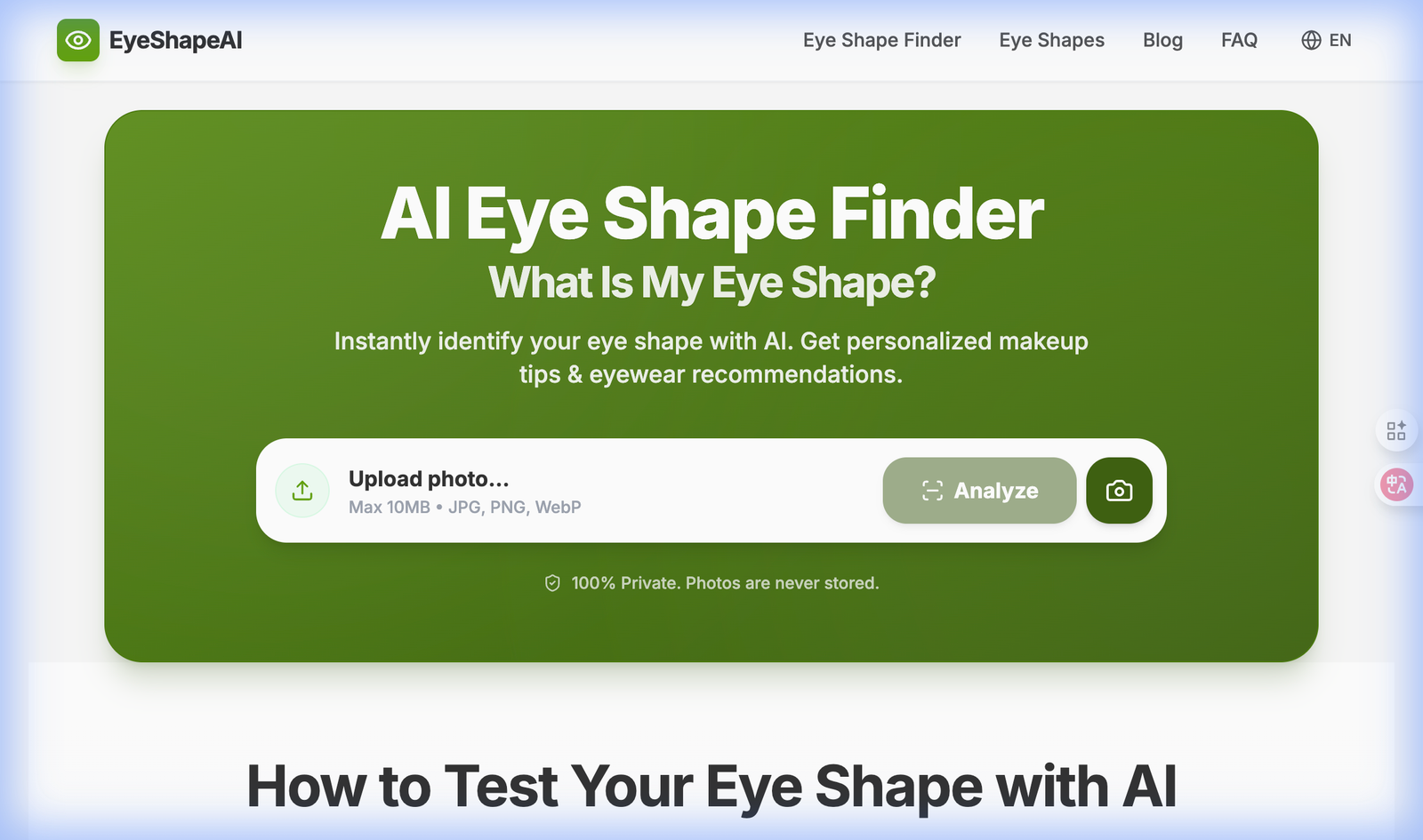 Descrição da ferramenta: AI Eye Shape Finder é uma ferramenta que utiliza inteligência artificial para identificar instantaneamente o formato dos olhos, oferecendo recomendações personalizadas de maquiagem e óculos com base na análise do usuário.