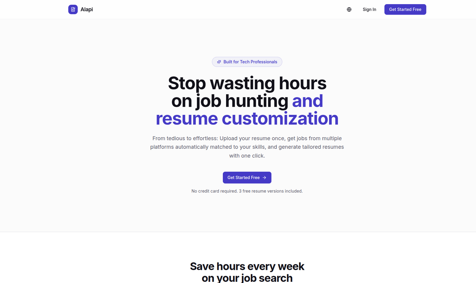 Descrição da ferramenta: Alapi é uma plataforma que analisa descrições de vagas e ajuda desenvolvedores a personalizar seus currículos, destacando habilidades relevantes, de forma estruturada e editável, facilitando a adaptação para diferentes oportunidades técnicas.