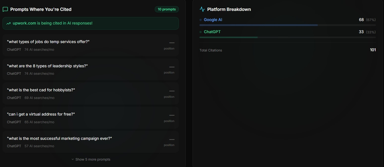 🔍 Análise de citações: Detecta onde seu conteúdo está sendo referenciado por diferentes plataformas de IA.