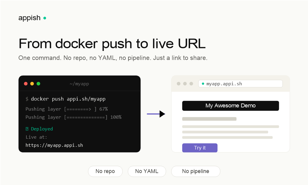 Descrição da ferramenta: APPISH permite criar demonstrações ao vivo de aplicativos a partir de um único comando Docker, eliminando a necessidade de repositórios, arquivos YAML ou pipelines. Ideal para protótipos rápidos, demos internas e previews para clientes.