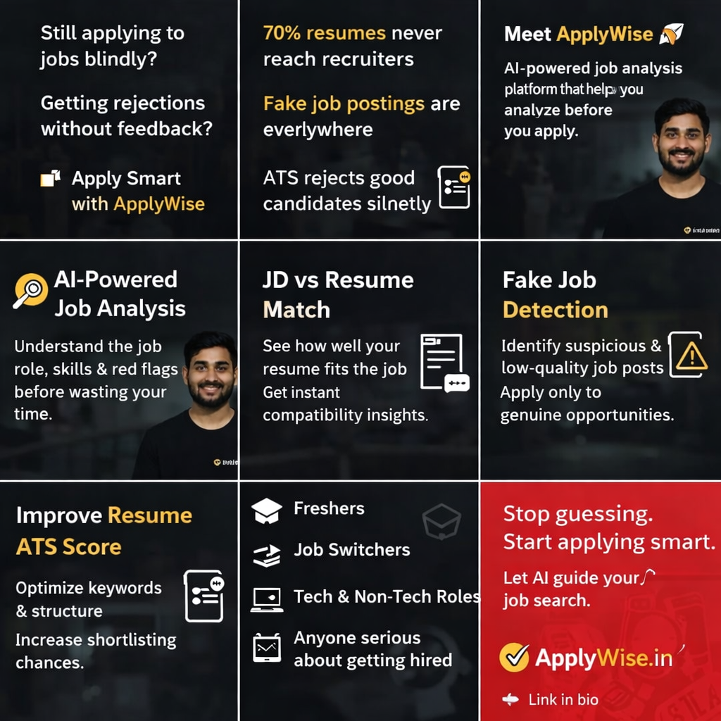 Descrição da ferramenta: ApplyWise é uma plataforma que analisa anúncios de emprego para verificar autenticidade, compatibilidade com ATS e probabilidade de contratação, oferecendo insights baseados em inteligência artificial para otimizar a candidatura dos candidatos modernos.