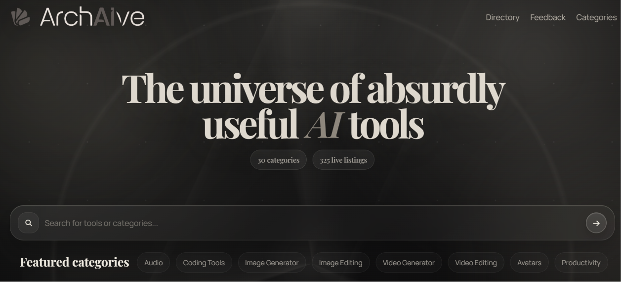 Descrição da ferramenta: ArchAIve é um hub organizado de ferramentas de IA para codificação, design, escrita e produtividade, oferecendo uma experiência intuitiva para criadores, estudantes e desenvolvedores na busca por recursos eficientes.
