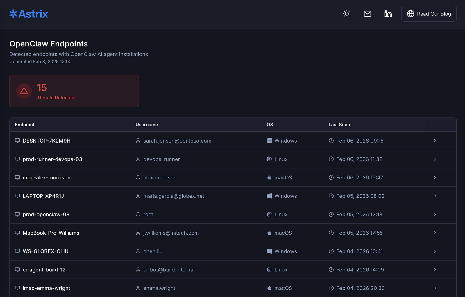 Descrição da ferramenta: O Astrix OpenClaw Scanner identifica agentes de IA Shadow OpenClaw em dispositivos endpoint, fornecendo informações rápidas e precisas para facilitar a mitigação de ameaças operando fora do controle organizacional.