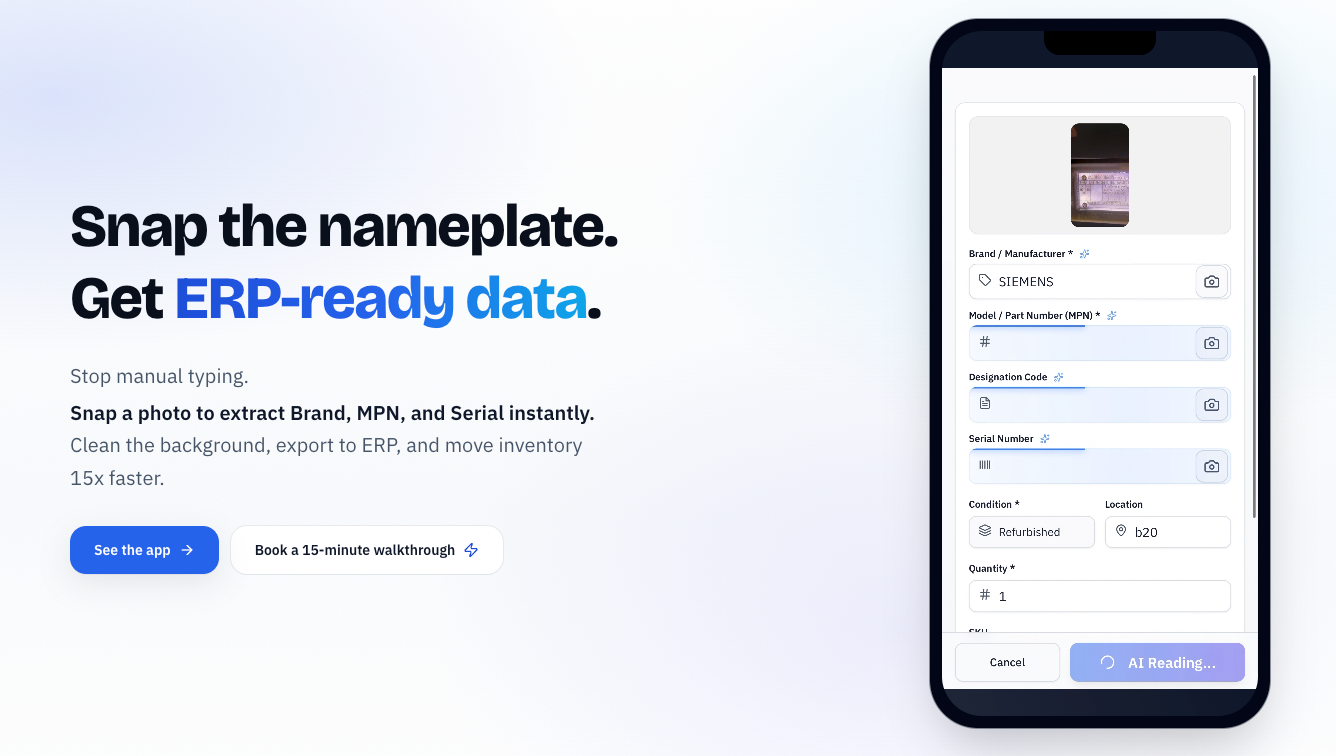 Descrição da ferramenta: AutomaSnap automatiza a captura de informações de etiquetas, extraindo dados como marca, MPN e serial, além de remover fundos de fotos e gerar planilhas para ERP em poucos segundos, otimizando processos de inventário e cadastro.