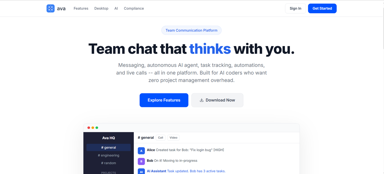 💬 Comunicação Diária: Equipes utilizam Ava para trocar mensagens rápidas durante o expediente.