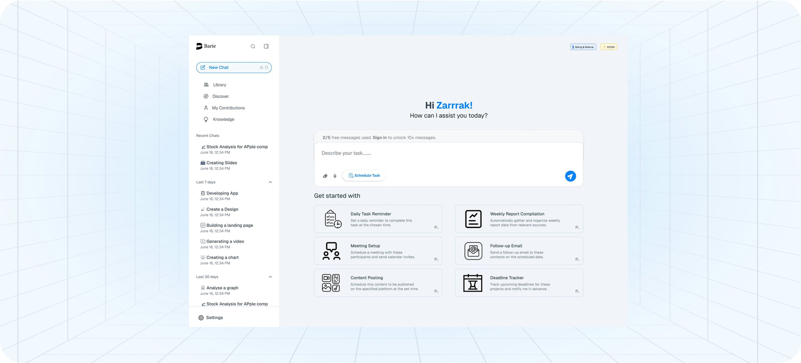 Descrição da ferramenta: Barie.ai é uma inteligência artificial orientada à execução, que planeja, pesquisa e atua em fluxos de trabalho reais, garantindo precisão, verificação de insights e integração direta com ferramentas para tarefas completas.