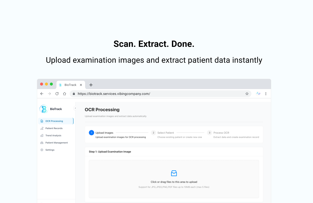 Descrição da ferramenta: BioTrack é uma plataforma que utiliza tecnologia avançada de OCR com inteligência artificial para converter impressões médicas desestruturadas em dados organizados e acessíveis, facilitando análises rápidas e precisas do progresso dos pacientes.