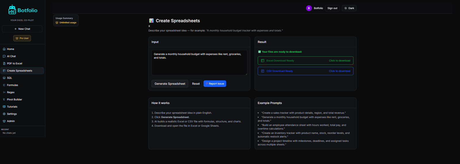 Descrição da ferramenta: Botfolio é um assistente de IA para Excel que converte comandos em inglês simples em planilhas completas, fórmulas, consultas SQL e arquivos PDF-to-Excel, otimizando fluxos de trabalho específicos de planilhas de forma rápida e eficiente.