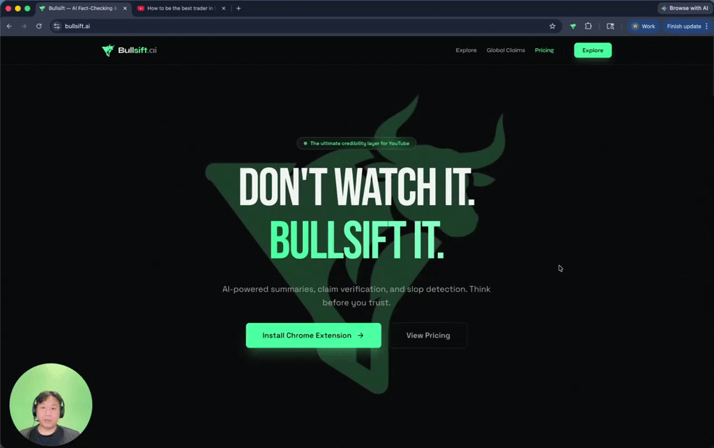 Descrição da ferramenta: Bullsift é uma extensão que realiza verificações de fatos em vídeos do YouTube em tempo real, fornecendo pontuações, fontes verificadas e confiabilidade dos canais, facilitando a identificação de informações falsas sem sair da página.