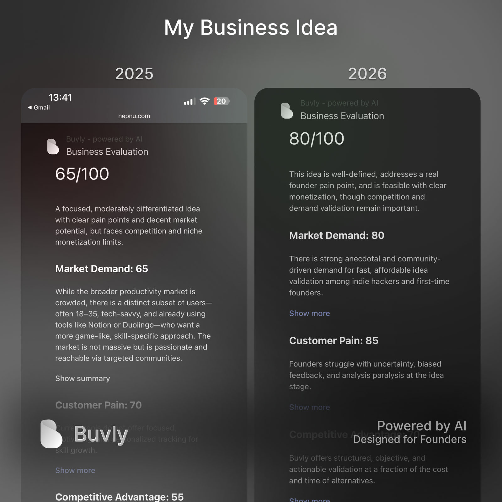 Descrição da ferramenta: Buvly é uma ferramenta de IA que avalia ideias de negócios por meio de um fluxo estruturado de 7 perguntas, fornecendo pontuações, insights escritos e recomendações concretas para orientar decisões rápidas e informadas.