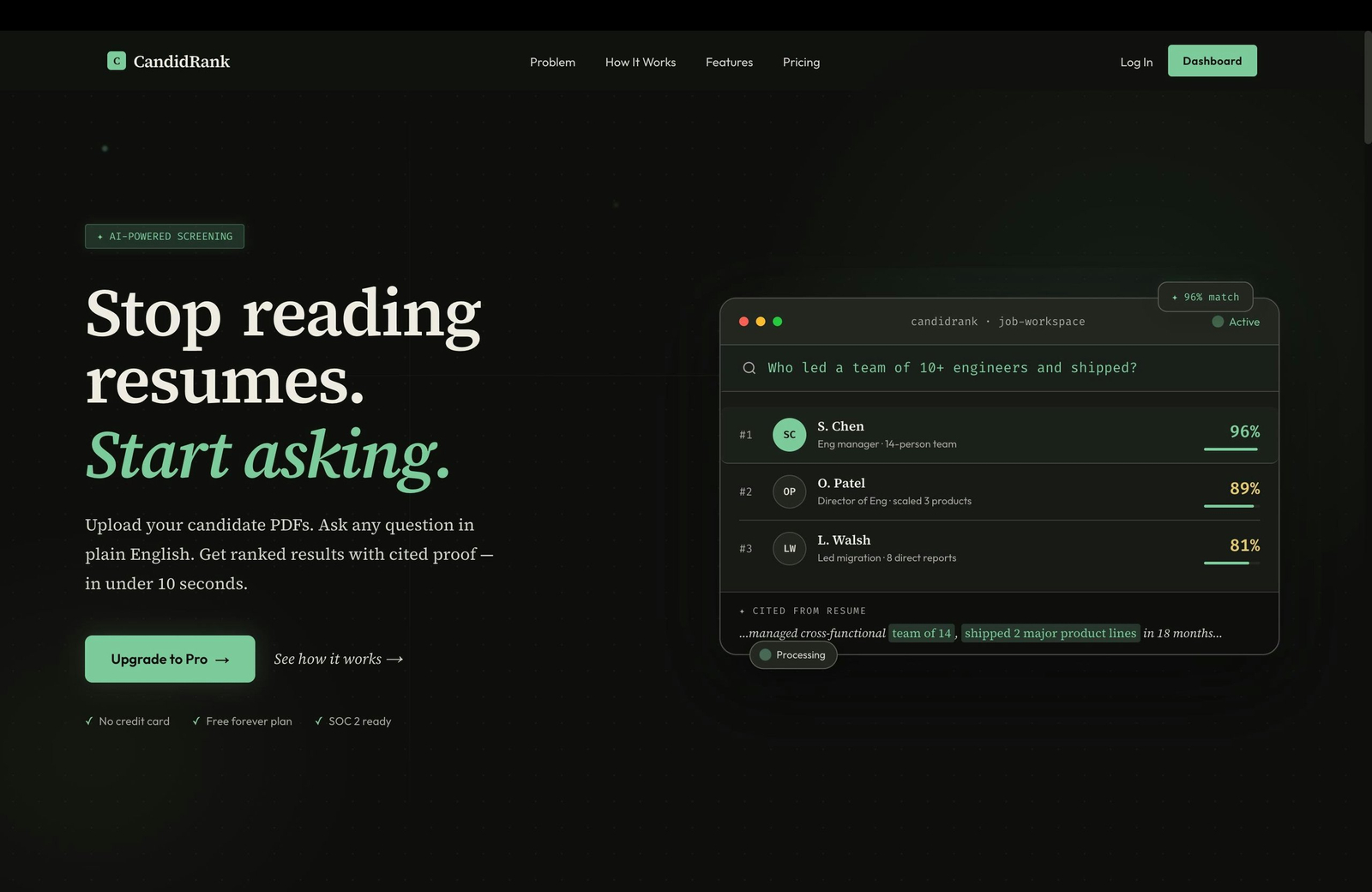 Descrição da ferramenta: CandidRank permite fazer upload de currículos em PDF, realizar perguntas específicas e obter resultados classificados por inteligência artificial, com provas citadas de cada currículo, otimizando a triagem de candidatos de forma rápida e eficiente.