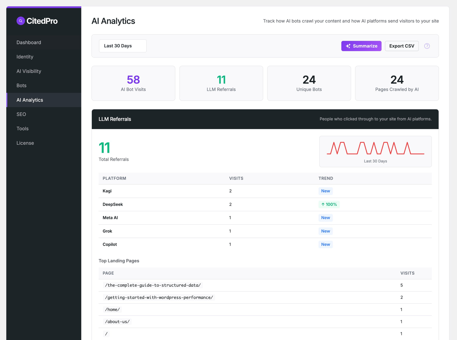 Descrição da ferramenta: CitedPro for WordPress é um plugin de SEO que integra otimização tradicional e recursos avançados de IA, incluindo rastreamento de bots, análise de referências LLM e controle de uso de conteúdo, aprimorando a visibilidade nas buscas do Google e IA.