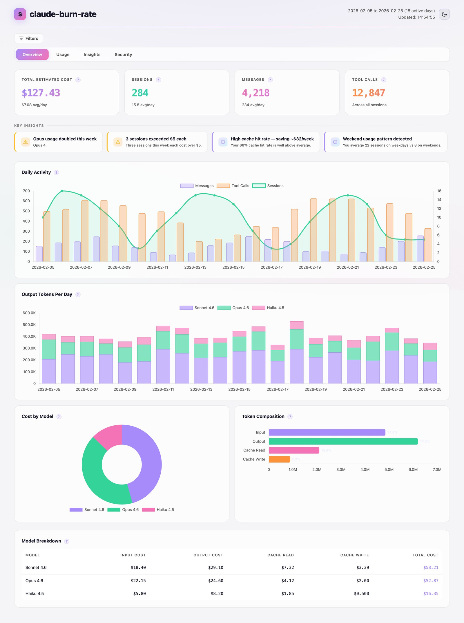 Descrição da ferramenta: Claude-burn-rate é uma ferramenta de linha de comando que monitora custos do Claude Code por branch, realiza auditorias de segurança e fornece métricas de eficiência, tudo de forma offline e sem necessidade de configuração prévia.
