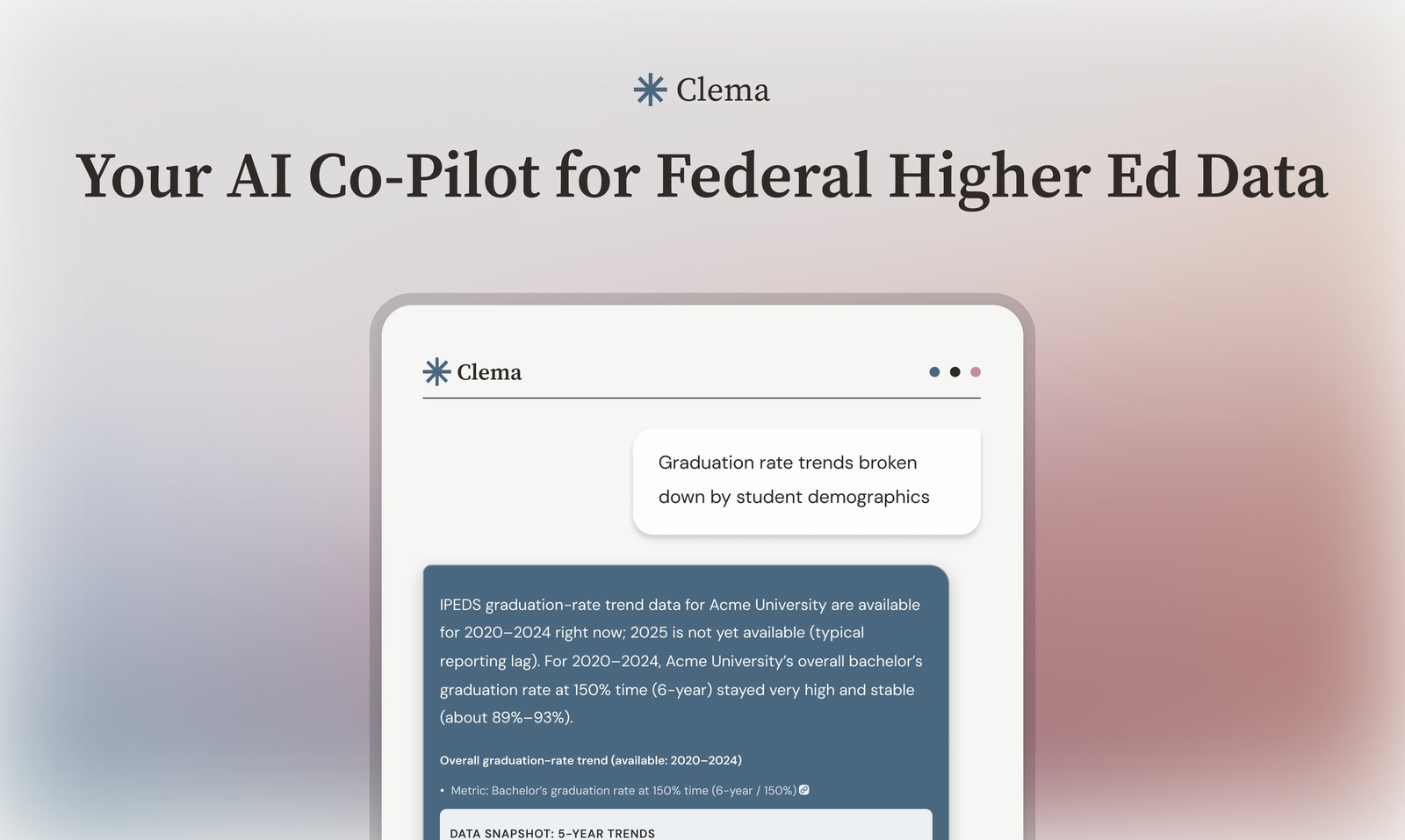 Descrição da ferramenta: Clema é uma ferramenta de inteligência artificial que permite consultar, comparar e exportar dados de instituições de ensino superior dos EUA usando linguagem natural, facilitando análises para equipes de IR e pesquisadores do setor.