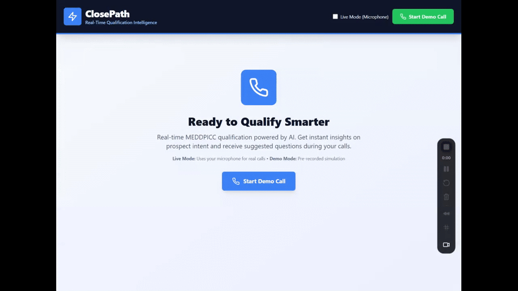 Descrição da ferramenta: ClosePath é um assistente de IA em tempo real para chamadas de vendas B2B, que analisa conversas ao vivo, identificando riscos, lacunas e próximos passos para auxiliar vendedores a entenderem o status de suas negociações.