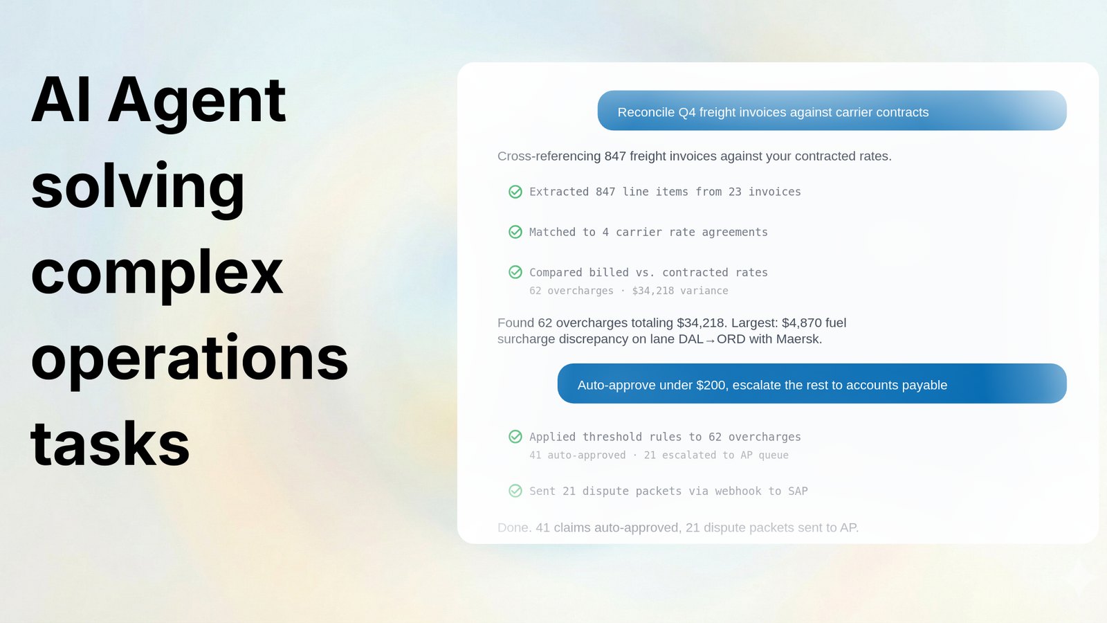 Descrição da ferramenta: Cloudsquid AI Agent for Finance & Ops automatiza processos integrados em ERP, portais, e-mails e planilhas, facilitando tarefas complexas com aprovações e evidências. Basta fornecer seus arquivos para otimizar operações entre sistemas de forma eficiente.