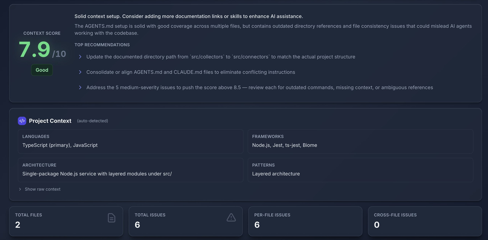 Descrição da ferramenta: O Context Evaluator é uma ferramenta de código aberto que analisa arquivos de contexto, como AGENTS.md e CLAUDE.md, identificando problemas de qualidade, lacunas e divergências entre documentação e código para manter informações atualizadas e precisas.