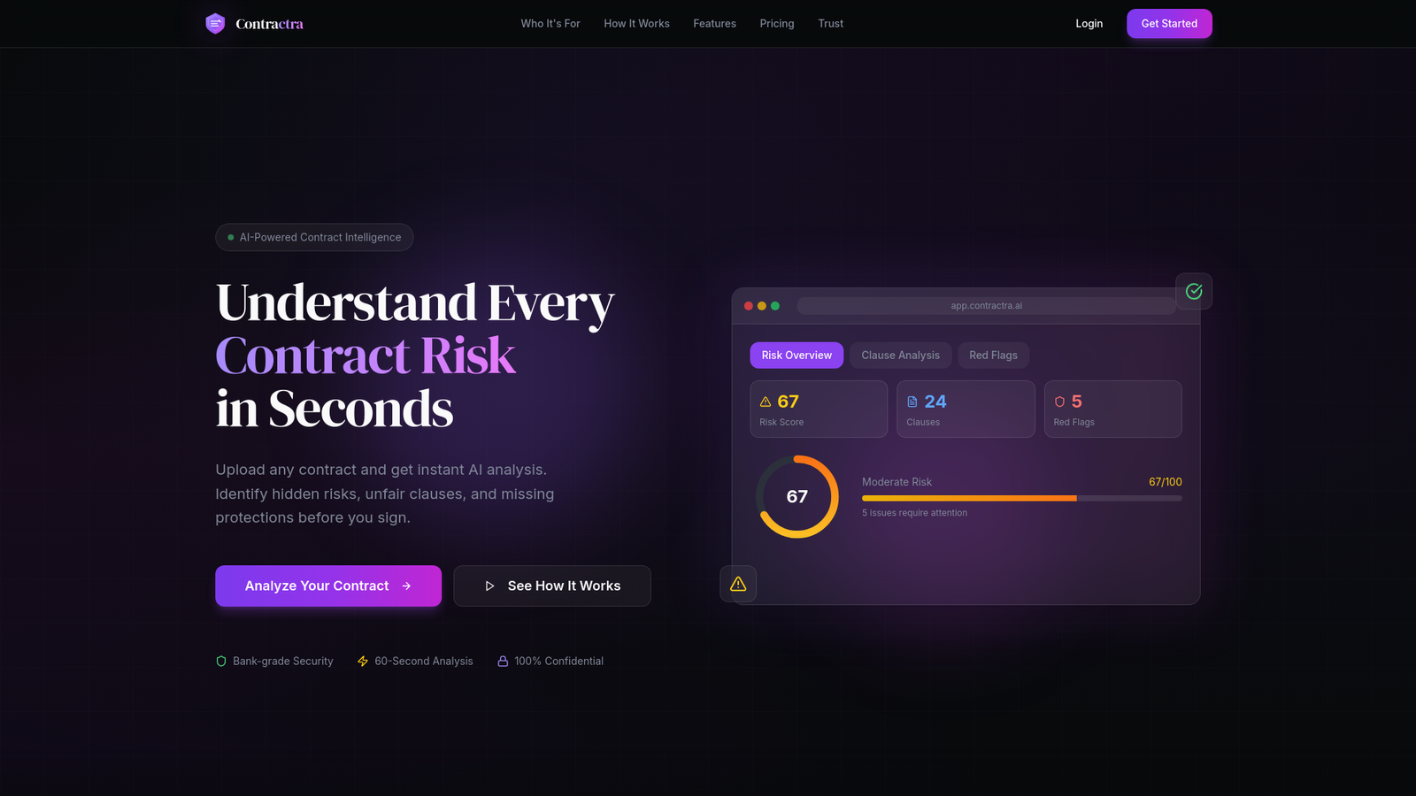 Descrição da ferramenta: Contractra é uma plataforma de análise de contratos alimentada por inteligência artificial, que fornece resumos claros, identificação de riscos e insights rápidos para facilitar a compreensão e tomada de decisão antes da assinatura.