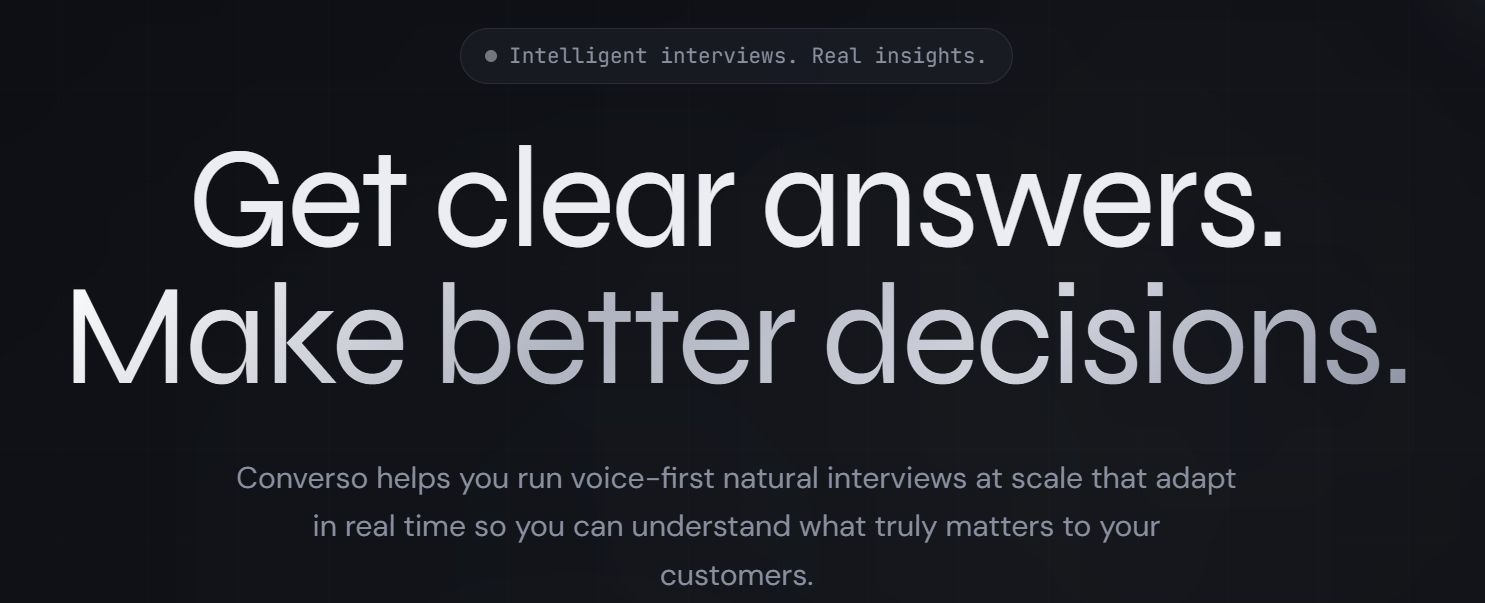 Converso é uma plataforma que realiza entrevistas por voz em tempo real, adaptando-se às respostas, e fornece análises automatizadas para transformar conversas em insights estratégicos de forma rápida e aprofundada.