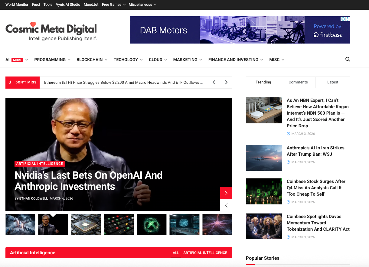 Descrição da ferramenta: CosmicMeta.ai é uma plataforma de mídia tecnológica alimentada por inteligência artificial, que oferece análises diárias, artigos originais e comentários especializados sobre tendências em IA, aprendizado de máquina, blockchain e programação para profissionais e entusiastas.