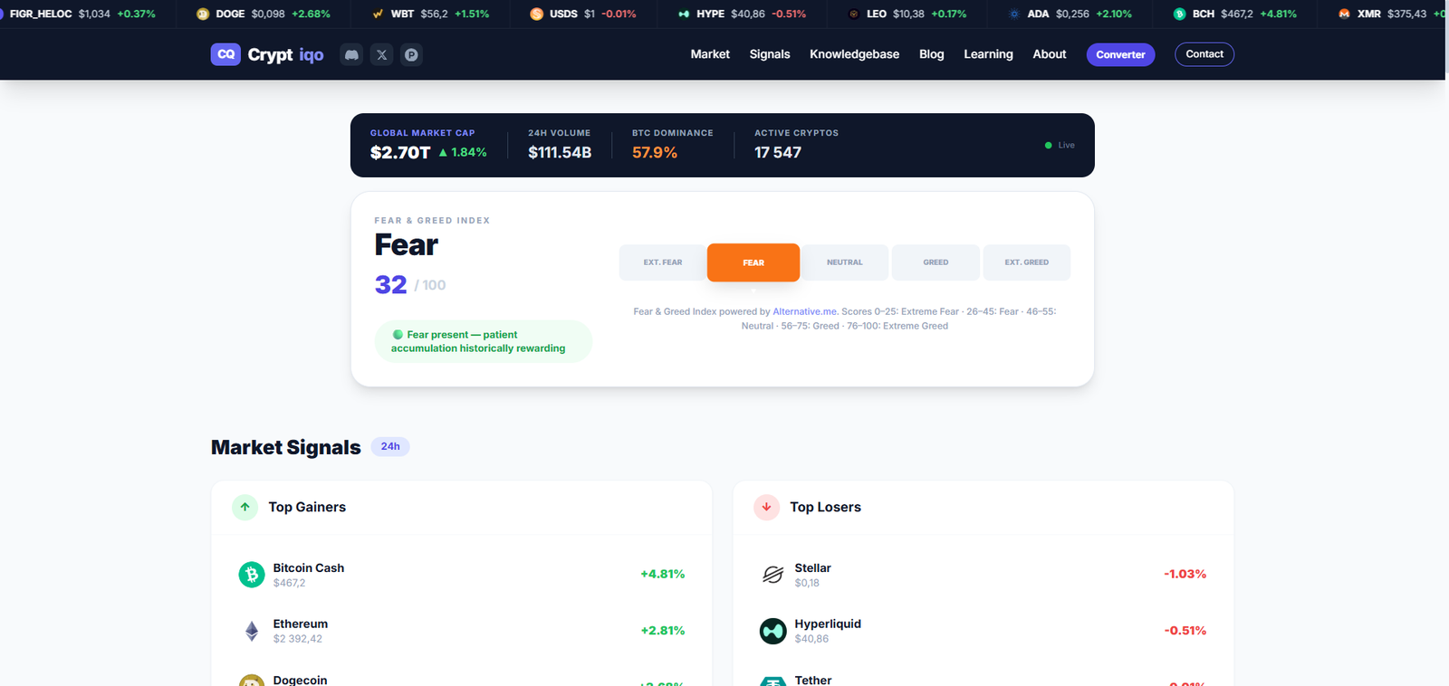 Descrição da ferramenta: Cryptiqo oferece inteligência de mercado em tempo real para criptomoedas, incluindo preços ao vivo, capitalização de mercado, índice de medo e ganância, conversor e recursos educativos, facilitando análises precisas e atualizadas.