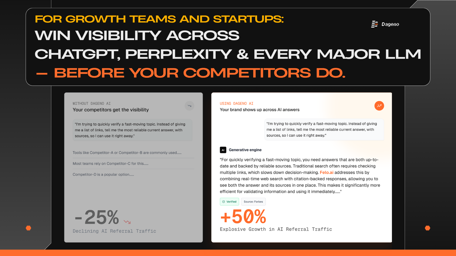 Descrição da ferramenta: Dageno AI monitora a visibilidade de marcas em mais de sete grandes modelos de linguagem, analisando dados de sites, tráfego, menções sociais e prompts para identificar lacunas e sugerir melhorias automatizadas.