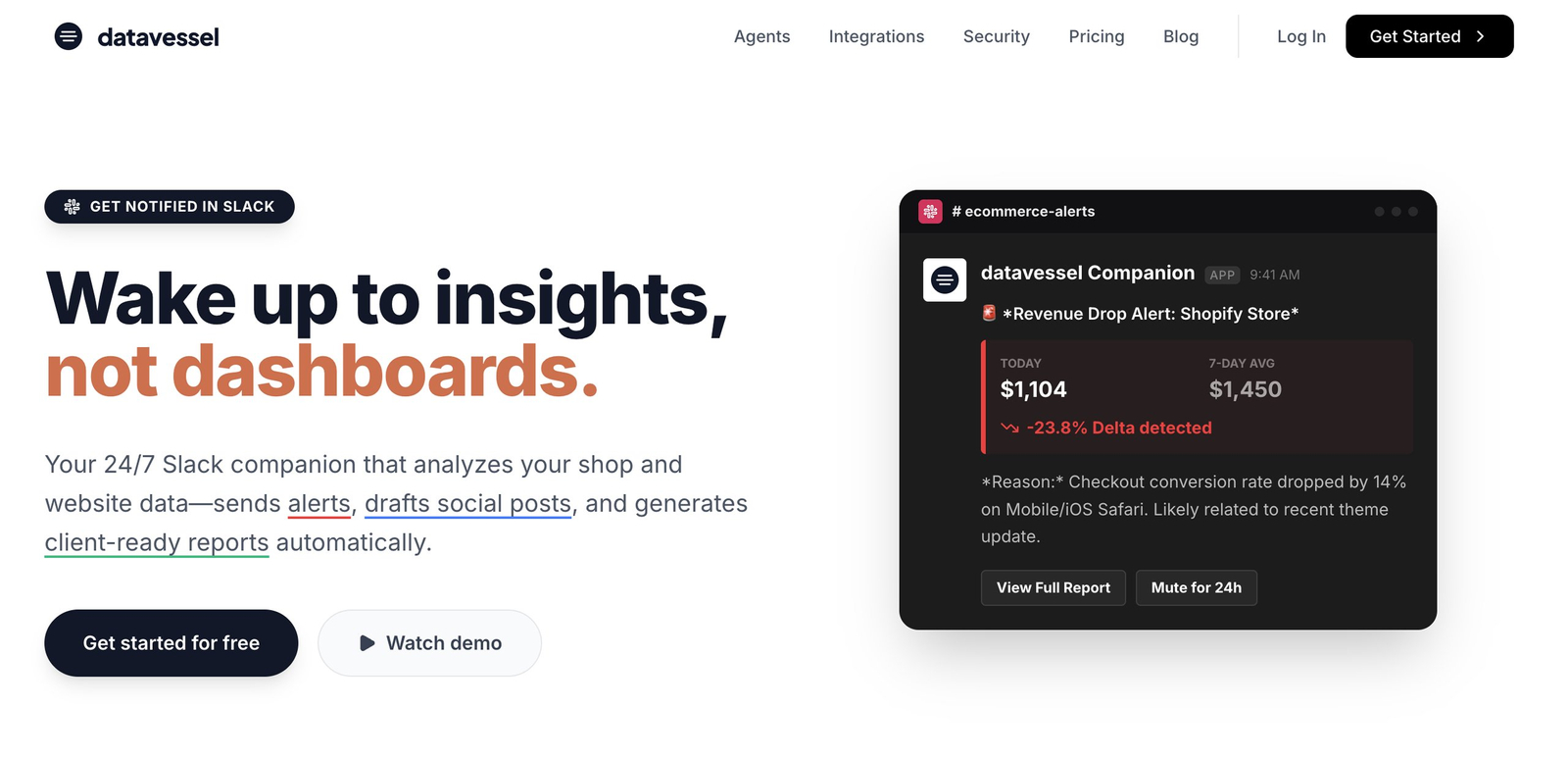 O datavessel é uma assistente inteligente integrada ao Slack que monitora dados de lojas e sites, enviando alertas, criando posts para redes sociais e gerando relatórios automatizados prontos para clientes.