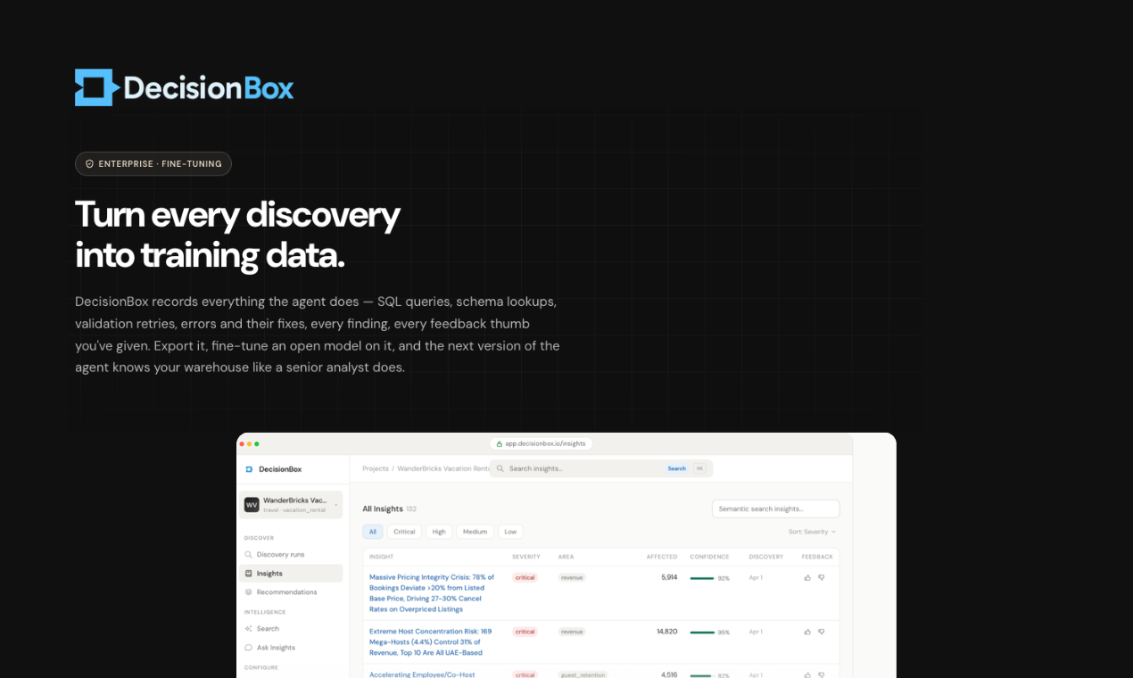 Descrição da ferramenta: DecisionBox Fine-Tuning é uma solução de inteligência artificial autônoma que realiza descobertas e análises personalizadas em seu data warehouse, utilizando seus próprios dados, esquema e terminologia, garantindo segurança e desempenho na sua infraestrutura.