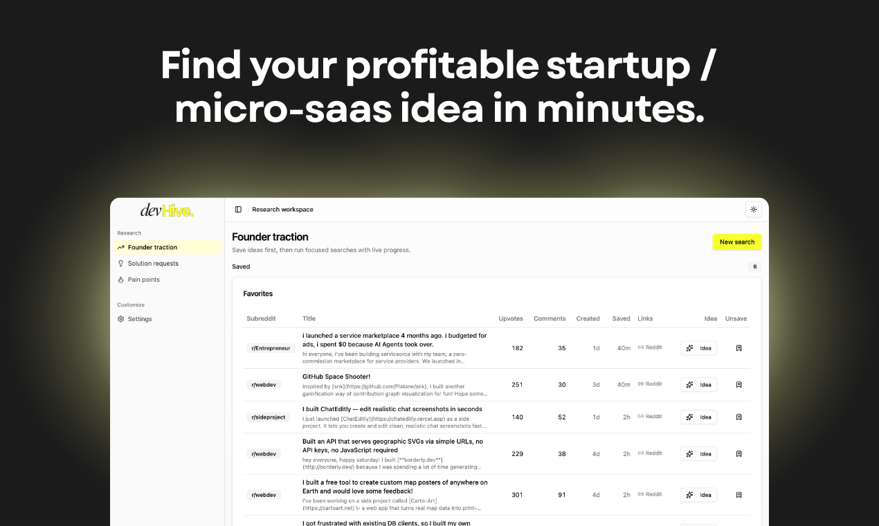 Descrição da ferramenta: DevHive é uma plataforma que transforma a análise de Reddit em um fluxo de trabalho de pesquisa, identificando ideias lucrativas de startups e micro-SaaS com alta taxa de sucesso, facilitando a validação e o planejamento do produto.