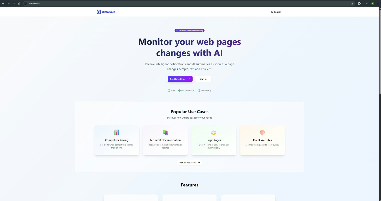 Descrição da ferramenta: Diffora.io é uma ferramenta de monitoramento leve e intuitiva que acompanha atualizações em páginas web, incluindo HTML e JavaScript, gerando resumos acessíveis por IA para facilitar a compreensão rápida das mudanças.