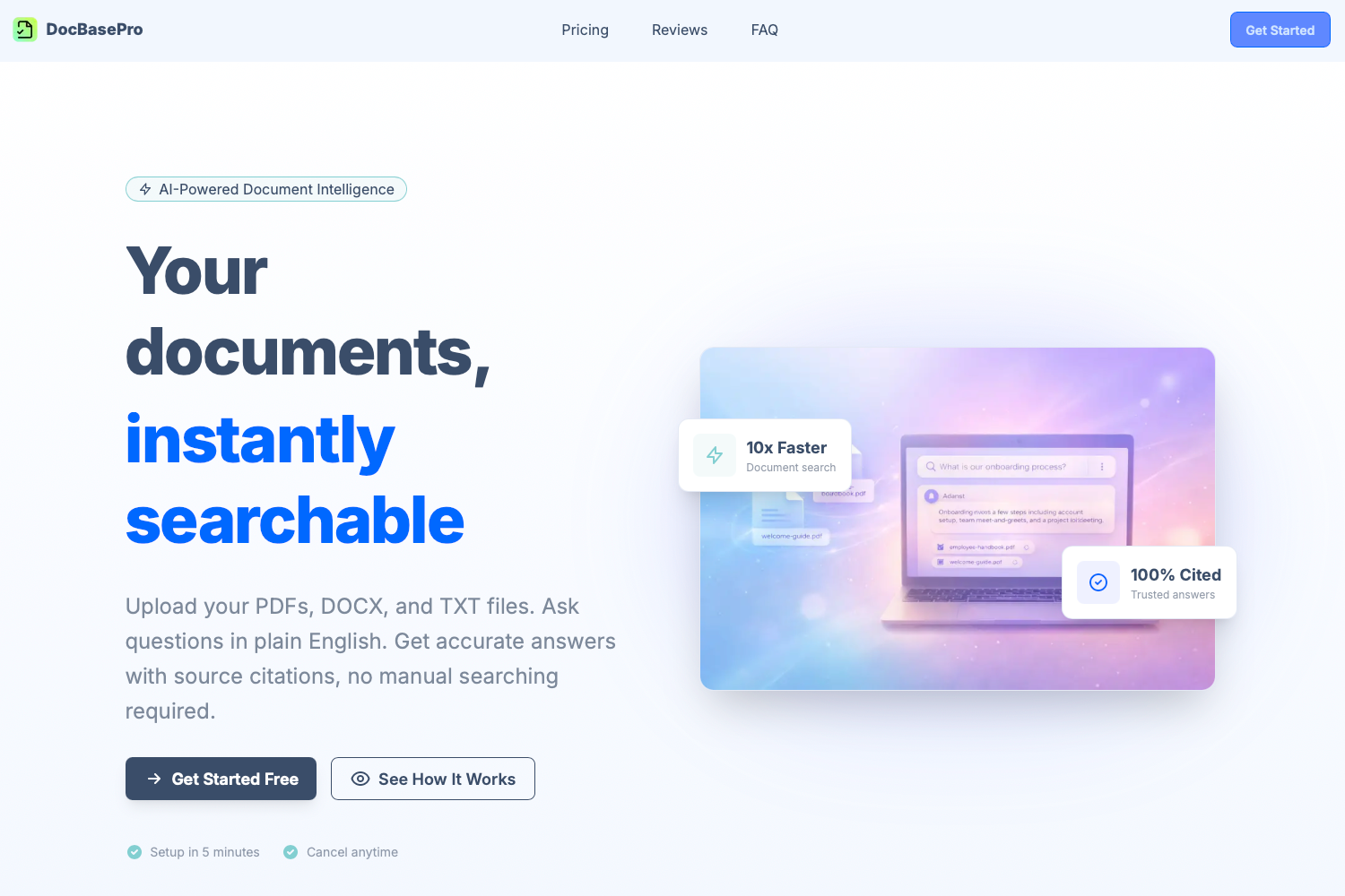 O DocBasePro é uma plataforma de busca e chat baseada em inteligência artificial que permite upload de PDFs, DOCX e TXT, oferecendo respostas rápidas com citações por meio de pesquisa semântica que compreende o significado do conteúdo.