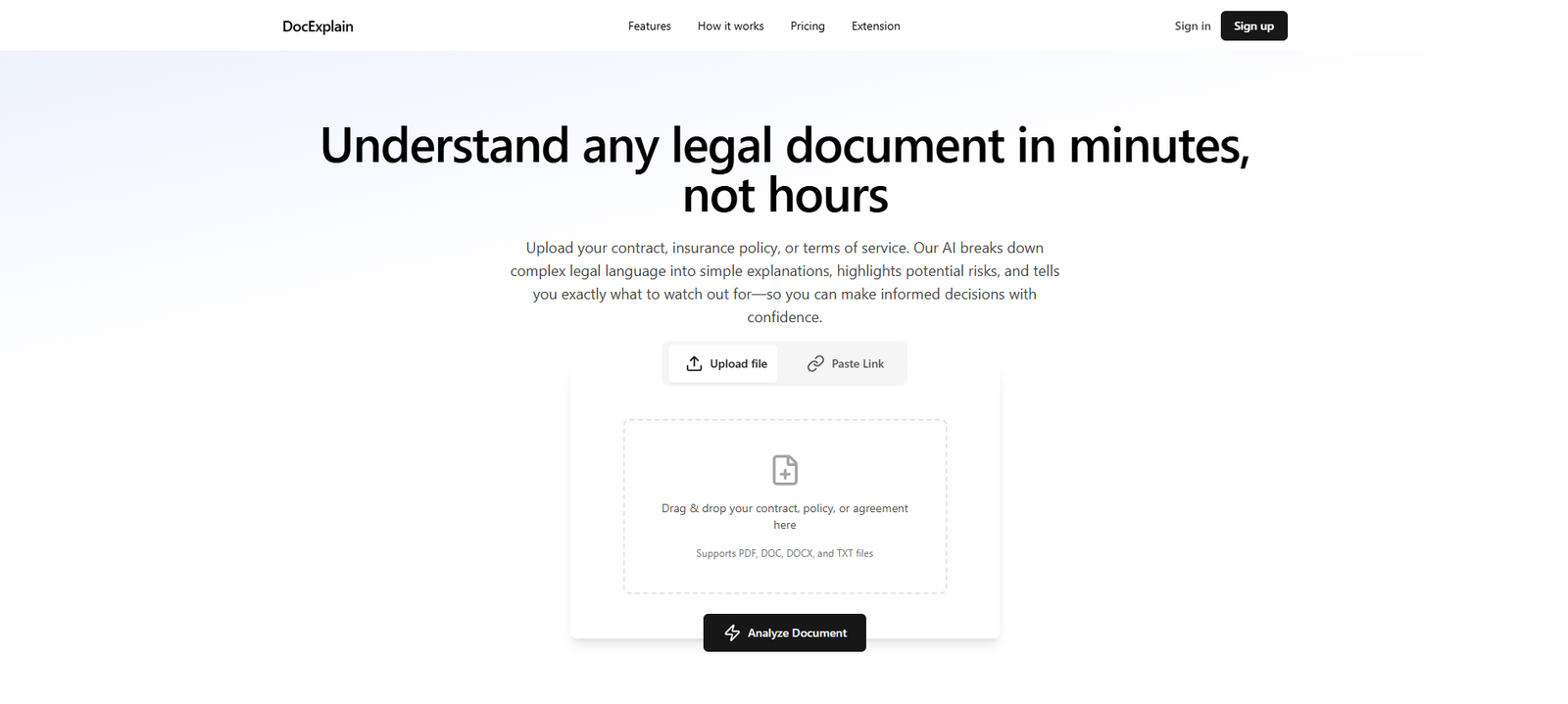 DocExplain é uma ferramenta alimentada por inteligência artificial que permite compreender documentos complexos rapidamente, oferecendo explicações claras e acessíveis de PDFs, Word ou textos, ideal para estudantes, desenvolvedores e profissionais.