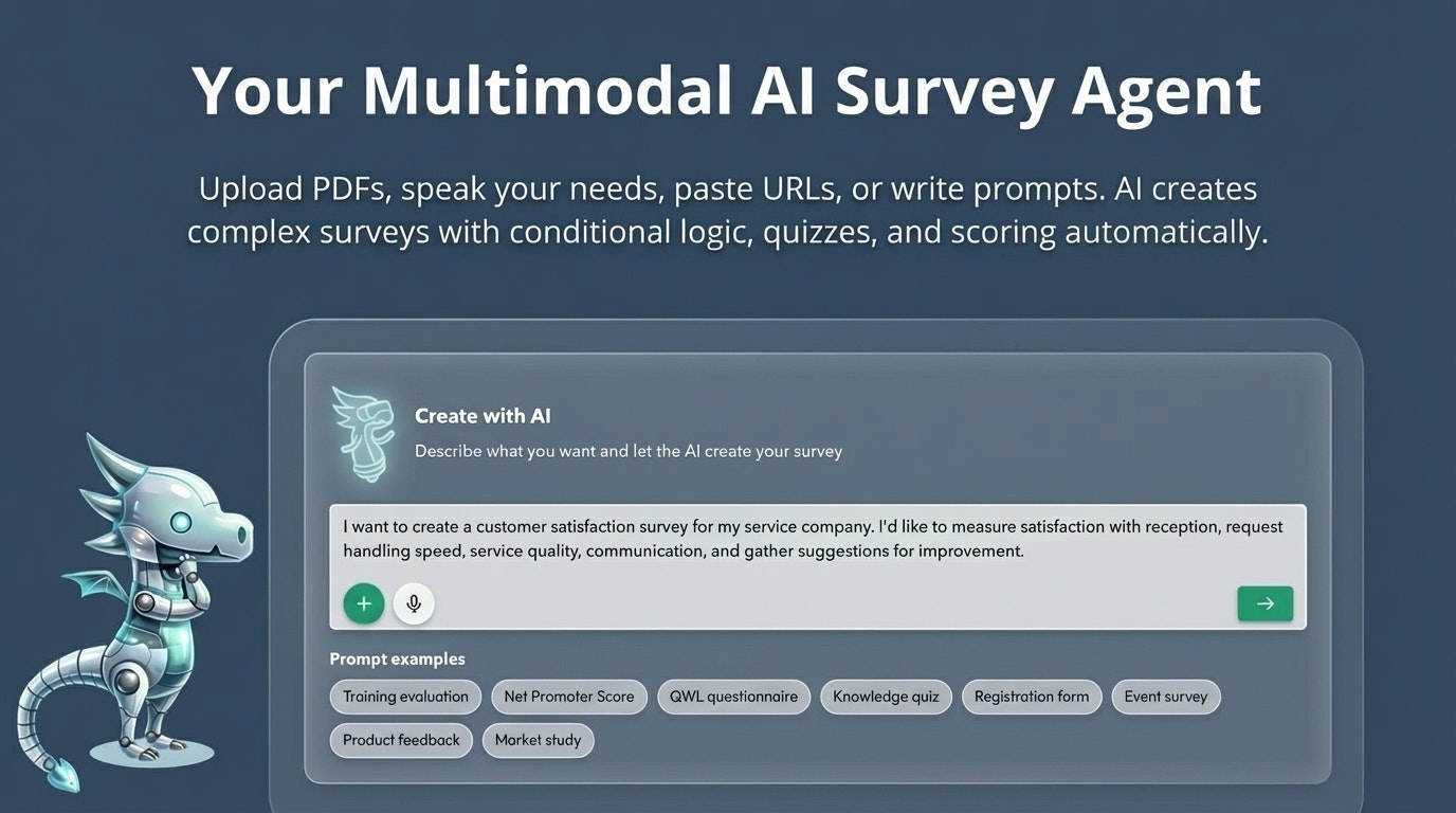 Descrição da ferramenta: O Drag’n Survey AI Agent é uma plataforma que permite criar, editar e analisar pesquisas de forma automatizada usando inteligência artificial, sem necessidade de experiência prévia em elaboração de questionários.