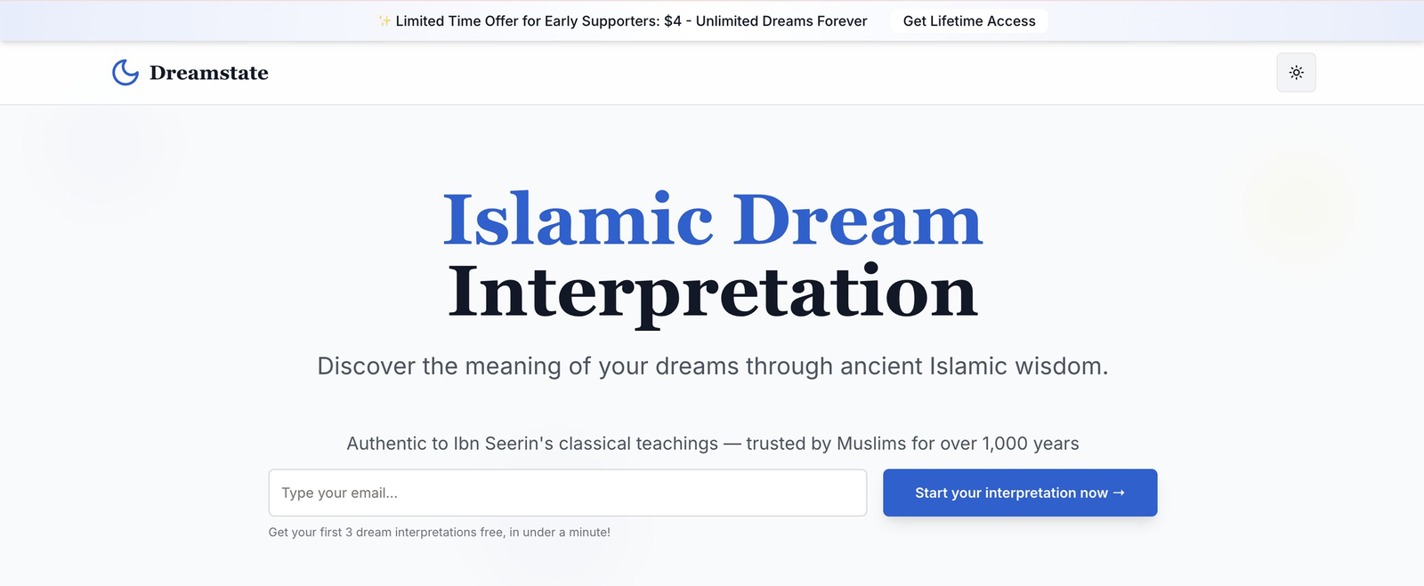 Descrição da ferramenta: Dreamstate é uma plataforma que interpreta sonhos utilizando conhecimentos tradicionais islâmicos, com análise alimentada por inteligência artificial baseada em mais de 4.300 símbolos do Dicionário dos Sonhos, oferecendo interpretações rápidas e autênticas.