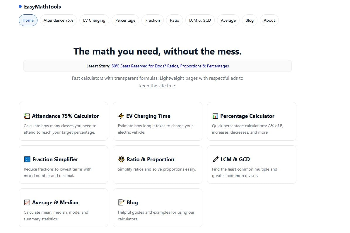 EasyMathsTools — Simple Calculators é uma coleção gratuita de calculadoras simples e transparentes, que realizam operações como porcentagem, frequência, tempo de carregamento de veículos elétricos, frações, razões, MMC/ MDC e médias, acessível diretamente no navegador sem necessidade de cadastro.